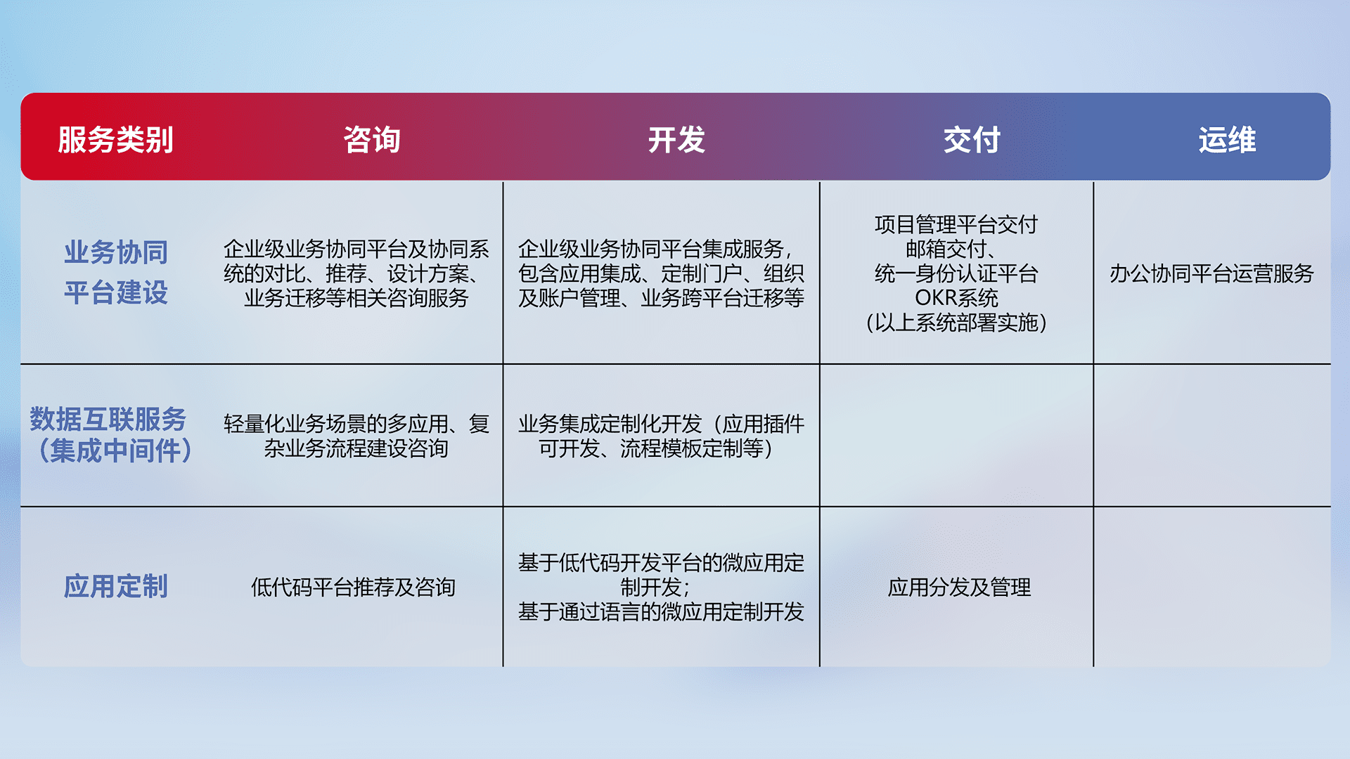 针对钉钉、、、企微、、IDaas等平台级产品提供产品的规划、、方案、、交付、、定制化开发等服务,,,,实现如统一协同办公、、智能客户服务、、、混合会议管理、、、智能数据查询、、、、等业务场景,,,,实现数字化转型。。